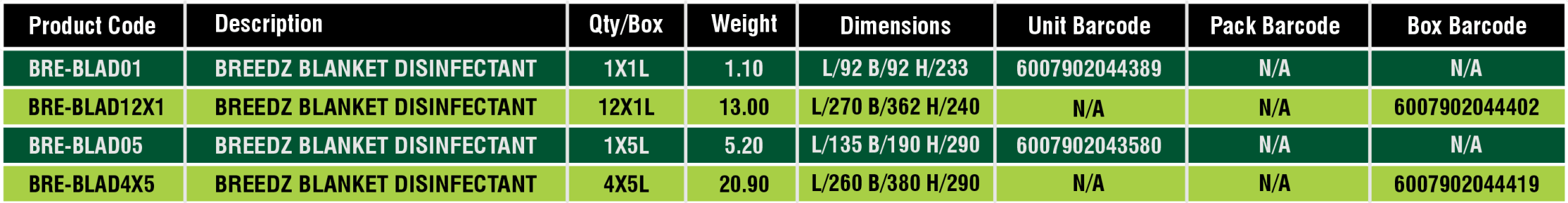 BREEDZ BLANKET DISINFECTANT is a green thin viscose liquid, with a neutral odour. It is a high