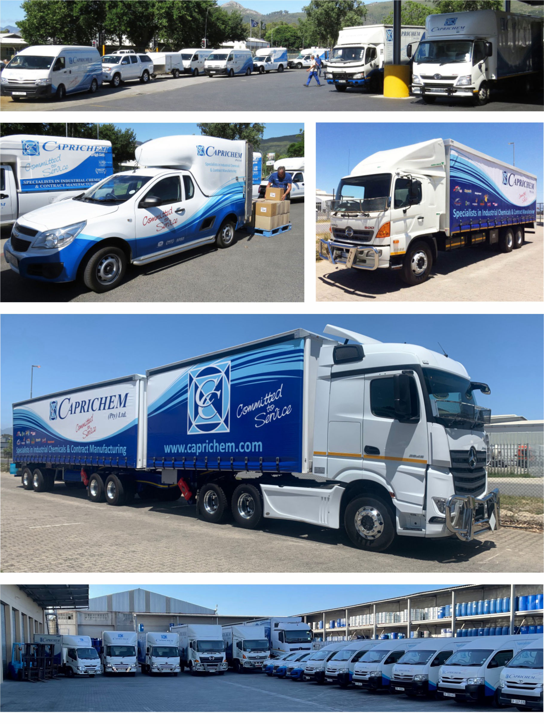 We have our own fleet of vehicles allowing Caprichem to be in total control of our distribution. We are mostly proud to state that we provide one of the best delivery services within our industry. Our policy is to deliver goods ordered within 24 hours of receipt of order to all local destinations. Our country routes have specific days allocated for deliveries to the outlying areas. Our contract manufacturing division does however operate differently as these orders are normally huge tonnage and are planned for accordingly.